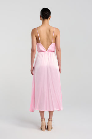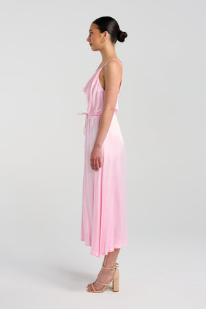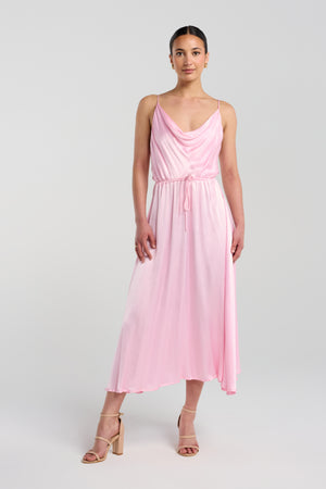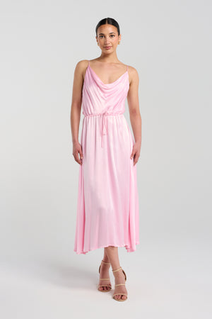 The Eyes On You Dress features a softly draped cowl neckline that blends timeless elegance with modern sophistication. Rich in detail with a subtle sheen, it frames the décolletage with effortless grace. A floaty skirt lends an ethereal feel and creates the illusion of length, moving beautifully with every step. Finished with a built-in drawstring waist, it allows for a personalised fit that gently cinches and flatters the figure