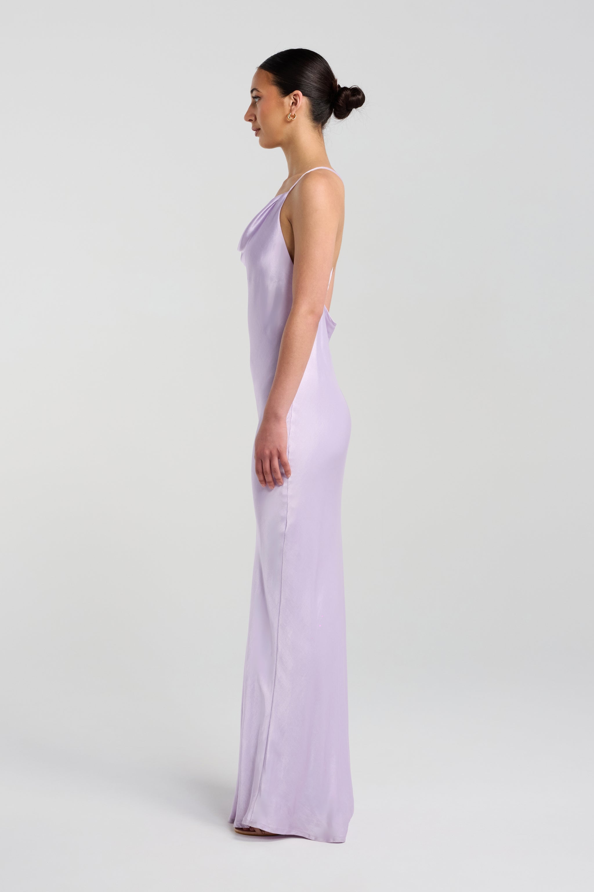 The Daylight Dress is the epitome of modern elegance. This full-length cowl neck gown is cut on the bias for a beautifully flattering fit that skims the body. The side split adds a touch of allure, while the crisscross back strap detail creates a graceful, feminine finish — perfect for any special occasion
